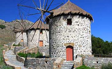 Kontias: La población más hermosa de la isla, un pueblo de antiguos armadores con numerosos molinos de viento semiderruidos, hermosas mansiones de piedra, diamantes de la arquitectura local, y una destilería donde se produce ouzo.