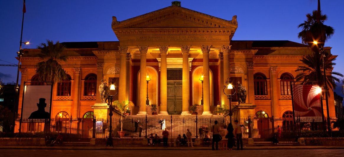 Teatro Massimo: La obra maestra neoclásica del arquitecto siciliano Giovanni Battista Basile y su hijo Ernesto fue construida entre 1875 - 1897 y se considera el mayor teatro lírico (en aforo) de Italia. En la monumental escalera exterior del edificio se rodó la emblemática última escena de «El Padrino ΙΙΙ», de Francis Ford Coppola.