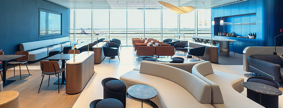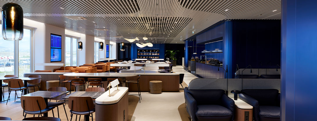El diseño se inspira en la arquitectura sencilla y elegante de Grecia, refleja la tecnología punta de nuestros aviones e incorpora nuestra nueva identidad de marca. Los bordes curvos y suaves y las formas fluidas, junto con una combinación de materiales de alta calidad como el mármol, el terrazo, el vidrio y la madera, dan vida a un espacio moderno y de vanguardia construido en torno a su comodidad.